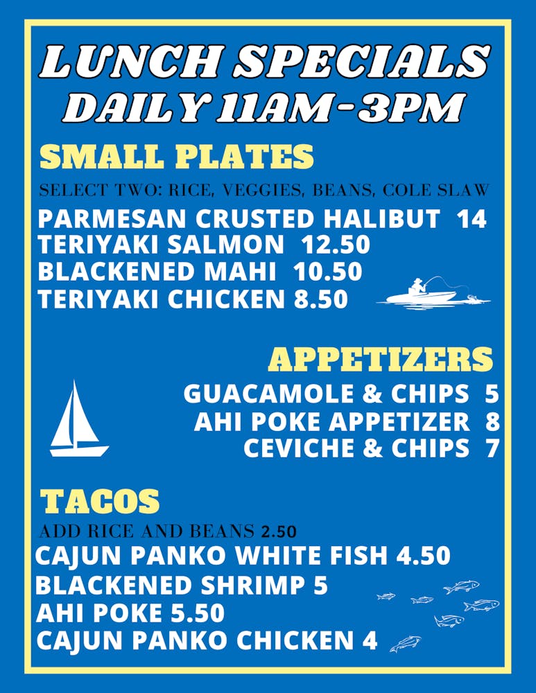 Bowls: 1/3lb of Fish with Two Sides and Choice of Sauce Plates: 1/2 lb of Fish with Two Sides and Choice of Sauce-